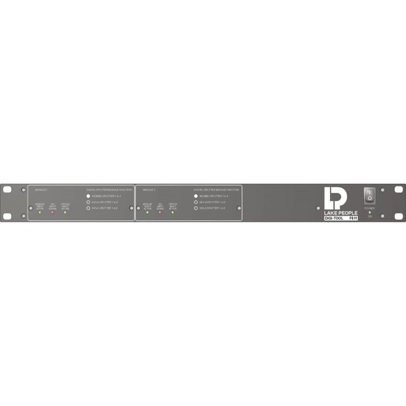 Lake People DIGI-TOOL F611 är en digital fördelningsenhet för AES/EBU-signaler, utformad för att skicka digital ljudsignal från två ingångar till upp till åtta utgångar samtidigt. Den är anpassad för professionella ljudmiljöer där stabil signalhantering med låg fördröjning och hög signalintegritet är avgörande – till exempel i studio, broadcast och liveproduktion.