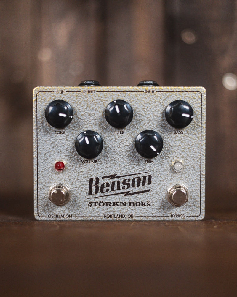 Benson STÖRKN B0kš är en specialversion av den hyllade Stonk Box–pedalen, skapad i nära samarbete med gitarrikonen David Torn. Pedalen bygger på Bensons egen modifiering av den klassiska Tone Bender MK1, men erbjuder kraftigare bas, större dynamiskt omfång och mer experimentella möjligheter än originalet.