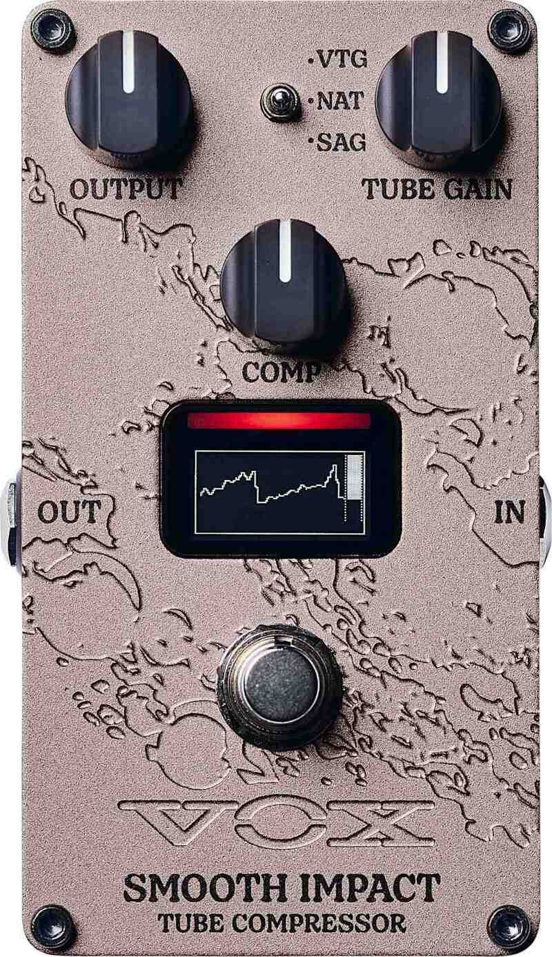 SMOOTH IMPACT is a genuine vacuum tube compressor that utilizes the gain variation resulting from fluctuations in Nutube's power supply voltage. It marks the debut of a pedal-type vacuum tube compressor, offering a distinct, natural playing feel unlike compressors of other types. Instead of conventional VCA, optical, or FET methods, it harnesses the non-linear realm of tubes, featuring harmonics derived uniquely from vacuum tubes, setting it apart from clipping.