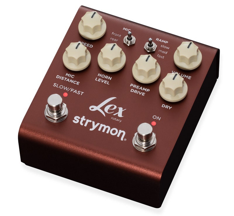 Lex V2 – a major overhaul sees dedicated knobs added for both output Volume and Dry Level to seamlessly blend wet/dry signals, a powerful addition. Strymon have also added switches for Speed Change Ramp-Time (slow/med/fast) and Front/Rear cabinet direction voicing, making it much more versatile and user-friendly. The Speed knob now adjusts the speed for both Slow and Fast mode, depending on which mode is active when the knob is adjusted.