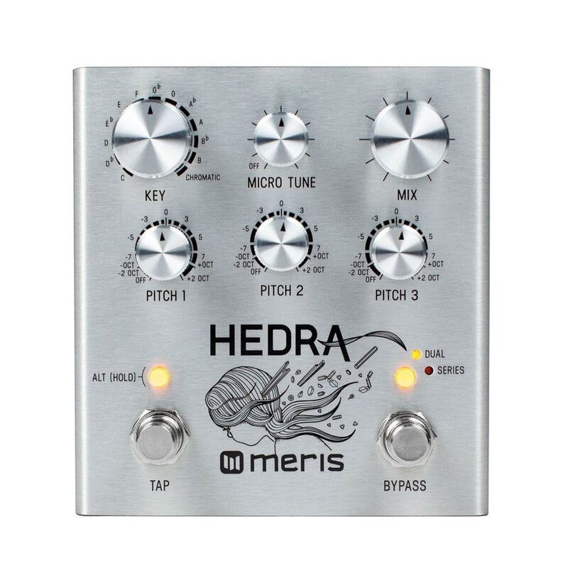 Every action has a reaction. A single stone thrown can create riveting ripple effects, while a humble key-turn can unlock a flurry of otherwise before unseen and unheard events. This is the magic Hedra bestows upon you and your instrument, seeing you unearth new harmonic sonic chain reactions with every single note played.The Meris Hedra is a 3-voice rhythmic pitch shifter capable of adding 3 harmony voices to your instrument and with Tap tempo synchronised delay available for each voice, this beauty far transcends the realms of standard pitch-shifting. In addition, pitch glide, micro tuning, 4 individual delay configurations, adjustable pitch correction and midi keyboard control all combine in making Hedra an instrument and sonic experience like no other.You can keep it simple and just use Hedra as a standard chromatic pitch-shifter. Or you can begin to pile on the intervals and slip into its dancing diatonic dreamscapes, via its 6 different scales and wealth of rhythmical subdivisions. Now turn up the Glide control and hold down TAP for auto-swelling synthy portamento shifts - or bump up the pitch regeneration - and you’ll be floating away on clouds of shimmering sci-fi effects. Hook a MIDI Keyboard or a MIDI Sequencer up to Hedra and turn your source instrument into a mind-bending tapestry of harmonies and hard-tuned pitch glides.Although it adds an entirely new dimension to the humble 6 (or more) string instrument, Hedra is not limited to just guitars. In fact, you can use the pedal on pretty much any instrument or line-level audio signal you want. Whether you choose to totally transform your beats on a drum machine, harmonise vocals or completely alter additional synths, loops or any other type of audio, Hedra’s advanced pitch-shifting palette is sure to transport you and your sound to entirely new sonic worlds.Features