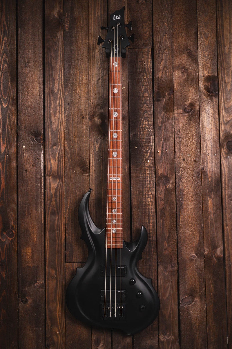 Tom Araya is the bassist and frontman of the iconic thrash metal band Slayer. His LTD Signature Series TA-204 FRX gives you the vibe of Tom's bass at a price that most musicians can afford. It's a bolt-on design at 35" scale, with a basswood body, maple neck, and a roasted jatoba fingerboard with 24 extra-jumbo frets and Slayer pentagram inlays. Components on the TA-204 FRX include ESP Designed SB-4 pickups.
