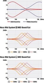 - EQ-funktioner: EQ bypass (push/pull), Hexa Mid system