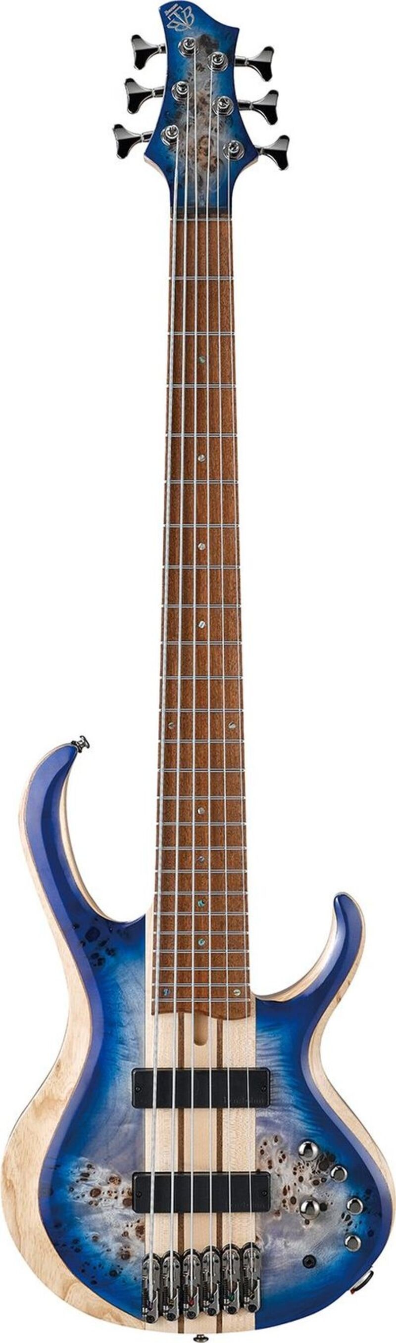Artikelnummer 1087966Elbas, 6 strängar, kropp i 5-delad lönn, jatobagreppbräda, Bartolini BH2 pickuper, Ibanez Custom 3-bands aktiv EQ/Preamp, färg: Cerulean Blue Burst Gloss