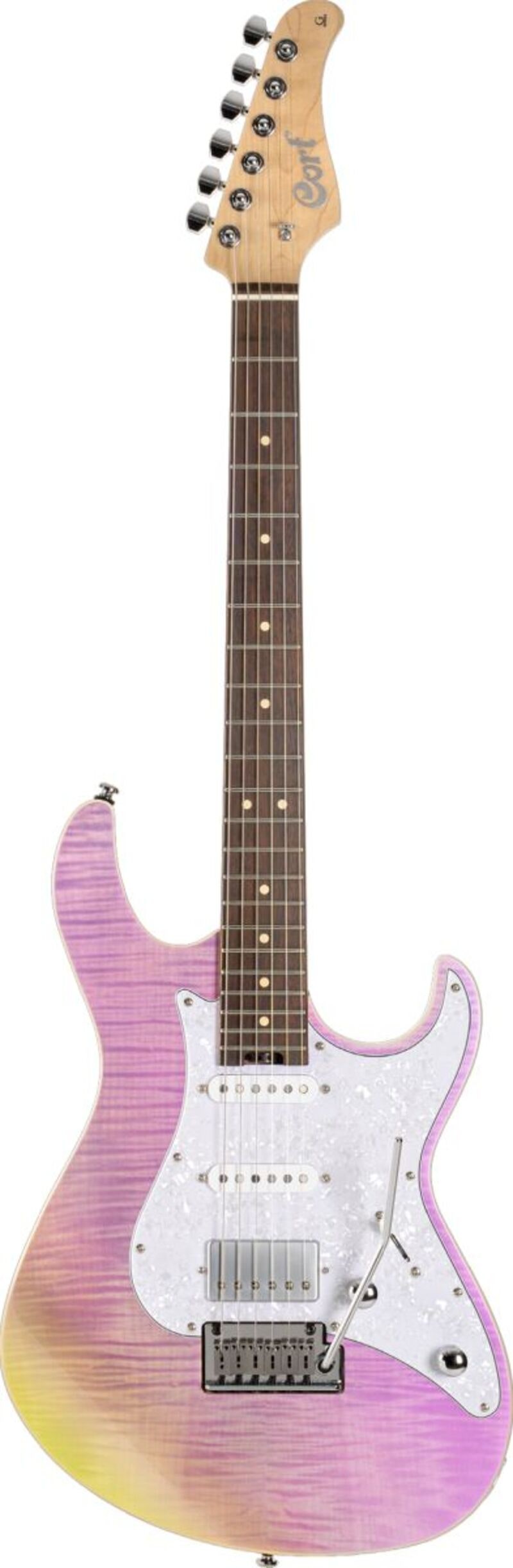 Cort G280 Select Trans Chameleon Purple är en elgitarr med Cort Voiced Tone VTS-63 & VTH-77 pickuper, 5-vägs pickupomkopplare och Cort CFA-III Tremolo-stall.