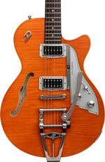 Artikelnummer 1090881Elgitarr, kropp i mahogny, lönnhals i medium "D"-profil, flammad lönntopp, greppbräda i indisk rosewood, Domino P90 & GrandVintage Humbucker pickups, färg: Transparent Orange
