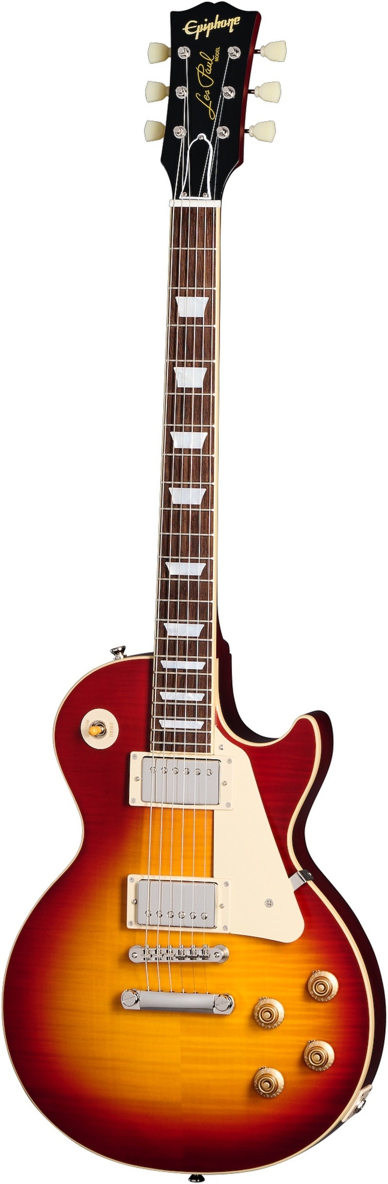 Made in collaboration with the Gibson™ Custom Shop, the Epiphone 1959 Les Paul™ Standard is Epiphone's incredible recreation of the rare vintage classic, updated to be more authentic and true to the originals than ever. It features a mahogany body with a maple top with a AAA flame maple veneer, a one-piece mahogany neck with a comfortable '59 rounded, medium C profile, long neck tenon, and Gibson-style "open book" R9 headstock shape, VOS (Vintage Original Sheen) finish, Gibson Custombucker humbucking pickups, Switchcraft® selector switch and 1/4" output jack, CTS® pots, 50s era wiring, Mallory™ capacitors, non-beveled pickguard, Epiphone Deluxe vintage tuners with Keystone buttons, and a vintage-style brown and pink hardshell case. Play one today, and prepare to be amazed!