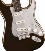 Fender American Ultra II Stratocaster har en utvald alkropp med skulpterade konturer. För oansträngd spelbarhet har den kvartskårad lönnhals, modern D-profil och en slät Ultra Satin-finish. Ebenholz- eller kvartskårad lönngreppbräda med 10"-14" compoundradie har Ultra-rundade kanter, medium-jumbo band, Luminlay sidopunkter och Graph Tech TUSQ sadel. Den avsmalnande nackanslutningen och de skulpterade kroppskonturerna ger oöverträffad åtkomst till de högre tonerna. Under huven levererar en trio av Ultra Noiseless Vintage Strat pickups allt från cleans till brännande leads, utan störande brus. Fenders S-1-switch låser upp ytterligare mikrofonkonfigurationer för ännu mer tonal variation. Ytterligare funktioner är 2-punkters American Ultra synkroniserat tremolo med klickbar arm, polerade sadlar i rostfritt stål, kallvalsad stålblock, deluxe låsmekanik, mjuka rattar och 1-lagers anodiserat aluminiumplektrumskydd.