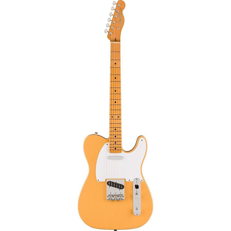 Artikelnummer 1096040Telecaster-modell i late ’50s-utförande, askkropp i Butterscotch Blonde, 1-delad lönnhals med 7,25" radie och Soft “V”-profil, två Vintage-Style Late ’50s Tele® single-coils