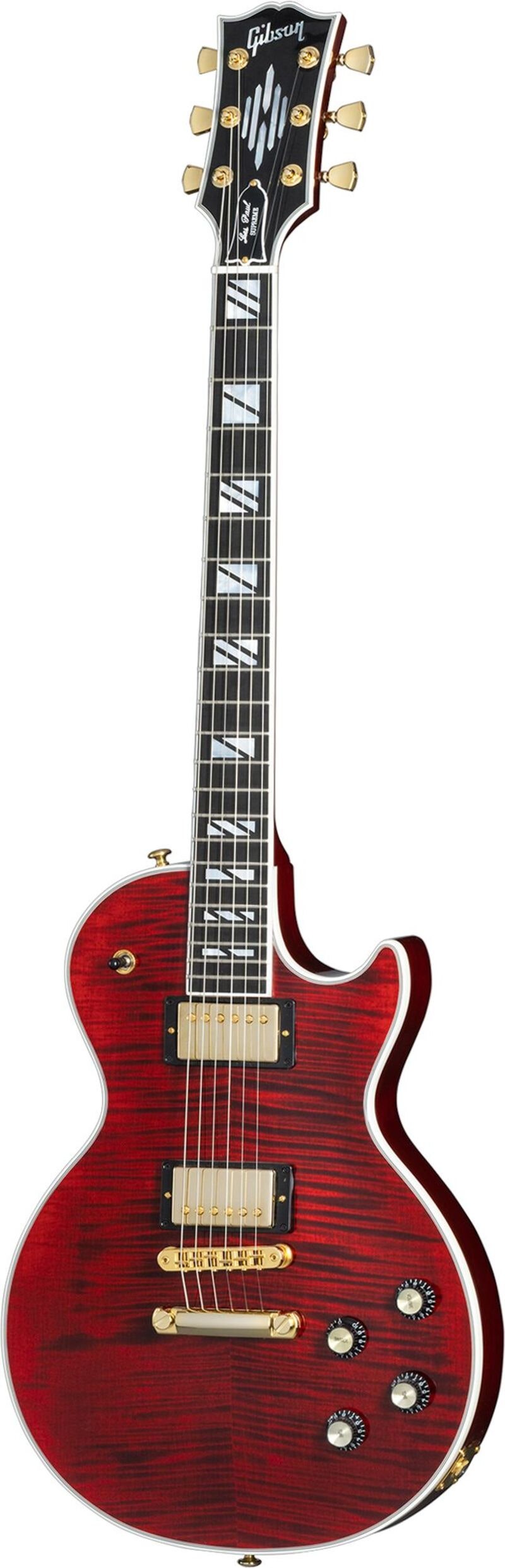 Gibson Les Paul Supreme återgår till den klassiska designen som gjorde den relevant. Med förbättrade funktioner får den all möjlighet att sticka ut i sortimentet. Den har en vacker AAA-figurerad lönntop på en mahoganykropp med ultramodern viktavlastning. Mahoganyhalsen har en greppbräda i ebenholts med compound radius och Super Split Block inlägg av pärlemor. Halsen har en modern contoured heel för exceptionell tillgång till de övre banden och huvudet är prytt med slående nya pärlemorinlägg inspirerat av Gibsons arkiv från 40-talet. De dubbla Burstbucker Pro mikrofonerna är kombinerade med push/pull volym och tonkontroller för flexibel coil cap, phase och Pure Bypass switching. De tre härliga ytorna är elegant framhävda med hårdvaror i guld. Detta gör att den inte bara låter ljuvligt och blir i högsta grad flexibel som instrument men den blir även en exceptionellt vacker och modern rockmaskin. Ett hardshell case ingår.