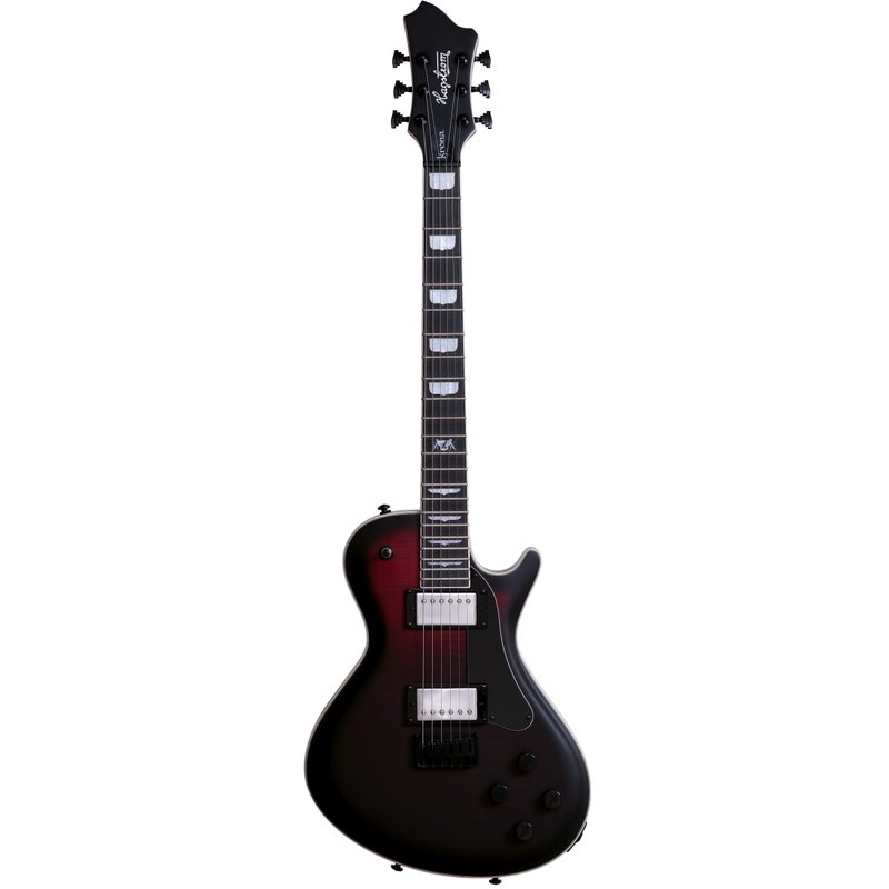 Artikelnummer 1096387Elgitarr, mahognykropp, lönntopp med flammigt lönnfanér, hals i kanadensisk lönn, Resinator-greppbräda, Agent‑X & Penetrator humbuckers, Hagstrom-stall i solid mässing (string-through)
