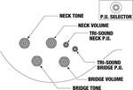 Med två Tri-Sound-switchar kan varje mikrofon konfigureras individuellt, vilket gör det möjligt att kombinera olika spolkopplingar för rytm- och solospel. Layouten är tydlig och traditionell, med fokus på flexibilitet utan att bli komplicerad.