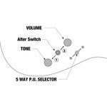 Artikelnummer 1092913Vänsterhänt elgitarr, 3 mikrofoner (SSH), dyna-MIX 9, Alter Switch, AZES-lönnhals, T-106 tremolo, 250 mm radius.