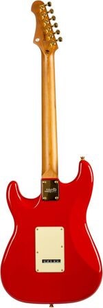 Gitarren är försedd med guldpläterade låsbara stämskruvar och en tremolo-brygga, vilket inte bara ger ett visuellt lyft utan också förbättrad stämhållning och flexibilitet i uttrycket. Den röda finishen tillsammans med gulddetaljer ger gitarren en elegant look som sticker ut.