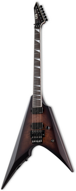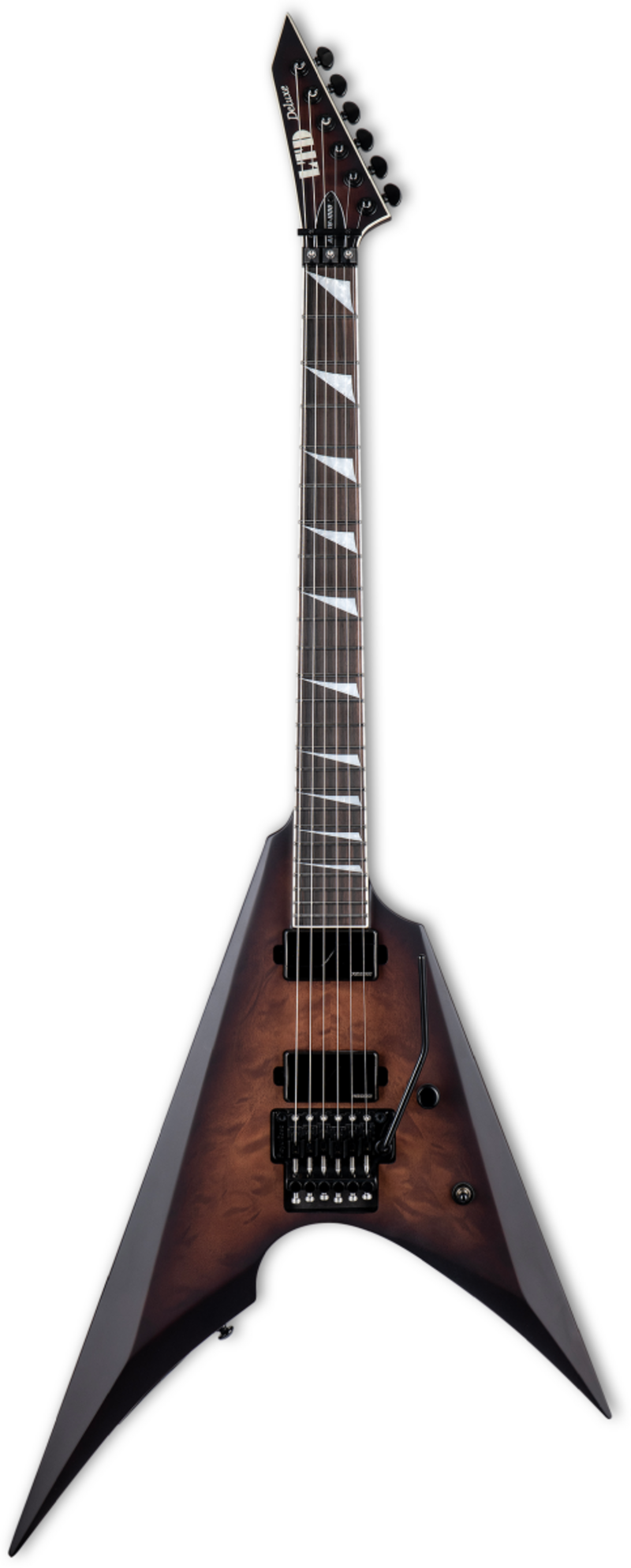 With its beveled body and completely unique V shape, this Arrow-1000 stands out from the crowd with its figured quilted maple top, looking superb in Dark Brown Sunburst Satin finish. It features neck-thru-body construction at 25.5” scale with a mahogany body. Its extra-thin u-shaped three-piece maple neck has a compound radius for improved playing comfort, and features a reverse headstock with matching finish, Macassar ebony fingerboard with triangular white pearloid inlays, and 24 extra-jumbo stainless steel frets. The Arrow-1000 includes a set of direct-mount Fishman Fluence Modern Humbucker active pickups (ceramic in the bridge and alnico in the neck), with push-pull control to select voicings and black nickel covers to match this guitar’s outstanding aesthetics. Each pickup offers two voices. With the ceramic bridge pickup, Voice 1 is the ultimate high-output ceramic humbucker bridge pickup tone. It has crisp, searing crunch, tight bass with no mud, and a growl. Voice 2 delivers modern passive attack performance that has superbly organic distortion characteristics with outstanding dynamics and response. The alnico neck pickup’s Voice 1 is Fishman’s modern active high-output tone, offering the ideal active alnico sound: full, round, and boosted, but with unprecedented articulation and dynamics. Voice 2 gives you the crisp, clean and fluid neck humbucker tone you’ve always wanted. Other components on the Arrow-1000 include a Floyd Rose 1000SE bridge with stainless steel screws and precise Grover tuners.
