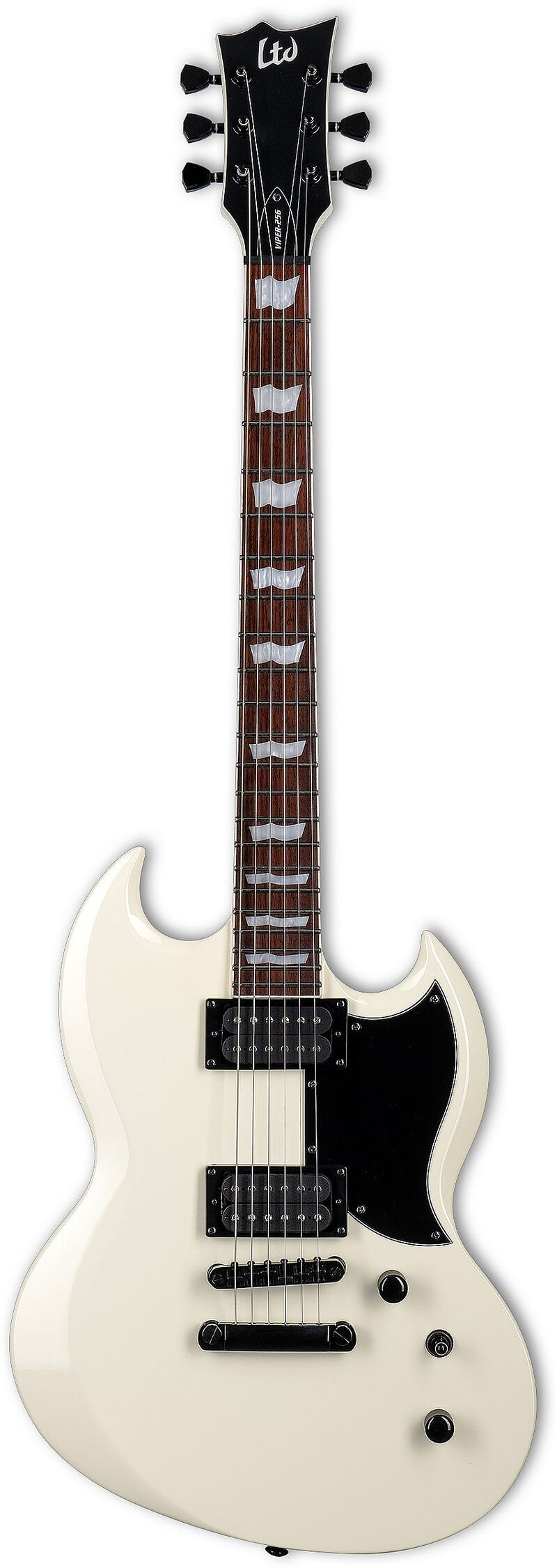 Like all guitars in the LTD 256 range, the Viper-256 delivers far more than you expect for its reasonable price tag. Using the ESP Viper shape with its outstanding double-horn styling, the Viper-256 uses traditional set-neck construction at 24.75” scale. It pairs a mahogany body with a thin u-shaped three-piece mahogany neck. Its roasted jatoba fingerboard has pearloid ESP flag inlays and 22 extra-jumbo frets, a design which maximizes the sweet spot for the neck pickup. Components on the Viper-256 include a black multi-ply pickguard, LTD tuners, a TOM bridge with tailpiece, and a set of punchy, powerful ESP LH-150 humbucking pickups with a push-pull control on the tone knob for coil splitting.