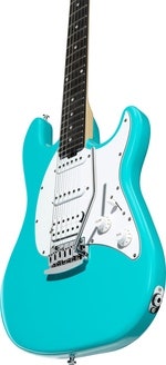 Artikelnummer 1086551Blå elgitarr, poppelkropp, hals i lönn, greppbräda i Purple Heart, keramisk humbucker & single coils, Fulcrum-tremolo.