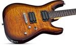The Schecter C-6 Plus Vintage Sunburst features a basswood body, bolt-on maple neck and rosewood fingerboard. It includes a Quilted Maple Image top, 24 X-Jumbo frets and chrome hardware. The guitar is equipped with a Tune-O-Matic bridge featuring string-through-body construction and two Schecter Diamond Plus humbuckers.