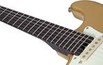 Den har samma grundspecifikationer och HSS-elektronik, men är byggd som vänsterhänt version i den unika Atomic Saffron-finishen.
