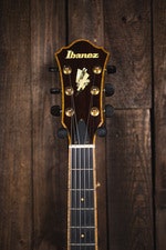 This model is equipped with gold-covered Ibanez Super 58 humbuckers in an HH configuration, known for their warm, vintage-inspired sound and dynamic response. The ART-W bridge with a wooden base and the VT04 tailpiece with a matching wooden cover complement the natural tone of the instrument while enhancing sustain. Additional premium details include rosewood control knobs and ebony half-moon button tuners for refined aesthetic balance.