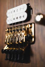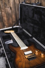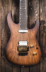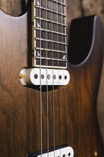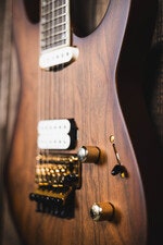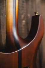 Begagnad, Elgitarr, mahogny/valnöt, neck-through, 24 band, HS-pickup, Floyd Rose tremolo, 12"-16" kompoundradie, satin hals, pearloid Piranha Tooth inlägg, full garanti