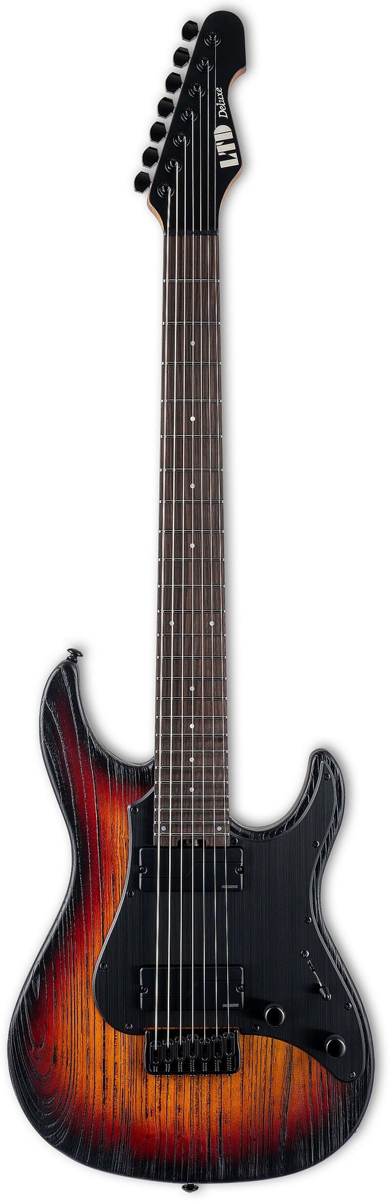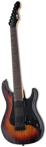 With seven strings and a 27” baritone scale, the SN-1007HT Baritone allows for serious extended range tuning. This guitar is ready to explore the depths of modern metal while bringing the heat with a sandblasted Fire Blast finish on its swamp ash body. It offers a bolt-on five-piece thin u-shaped roasted maple/purple heart neck. Its Macassar ebony fingerboard is crafted with a compound radius for maximum speed and comfort, and includes 24 extra-jumbo stainless steel frets, mother-of-pearl dot inlays, and is scalloped from frets 17-24. Components on the SN-1007HT Baritone include a 48mm black bone nut, a matte black pickguard, dome control knobs, LTD locking tuners, and a Hipshot hardtail bridge with string thru body. The SN-10007HT Baritone includes a set of Fishman Fluence Modern Humbucker active pickups (ceramic in the bridge and alnico in the neck), with push-pull control to select voicings and black nickel covers to match this guitar’s outstanding aesthetics. Each pickup offers two voices. With the ceramic bridge pickup, Voice 1 is the ultimate high-output ceramic humbucker bridge pickup tone… crisp, searing crunch, tight bass with no mud, and a growl. Voice 2 delivers modern passive attack performance that has superbly organic distortion characteristics with outstanding dynamics and response. The alnico neck pickup’s Voice 1 is Fishman’s modern active high-output tone, offering the ideal active alnico sound: full, round, and boosted, but with unprecedented articulation and dynamics. Voice 2 gives you the crisp, clean and fluid neck humbucker tone you’ve always wanted.