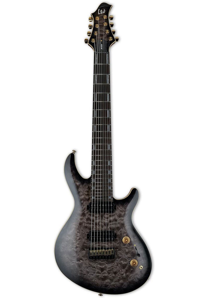 Javier Reyes is one of the most innovative guitarists in progressive rock today. He consistently pushes the boundaries of how the electric guitar can be approached in his band Animals As Leaders and in his solo work. A master of the 8-string guitar, Javier had detailed input into the creation of the LTD Signature Series JR-608. This combination of eight strings with a five-piece walnut/maple/padauk neck-thru-body design at 27” baritone scale allows you to explore a huge range of pitch on a single instrument. its features also include Graphtec Black Tusq nut, a Macassar ebony fingerboard with a custom inlay pattern, and glow in the dark side markers. It offers a swamp ash body with the resulting articulate sound, along with a figured quilted maple top. Top-tier components on the JR-608 include a Hipshot bridge with string-thru-body setup, and a set of Javier’s new Fishman Javier Reyes Open Core Signature Pickups, with a mini-switch to engage it’s multiple voicings. Available in Faded Blue Sunburst finish.