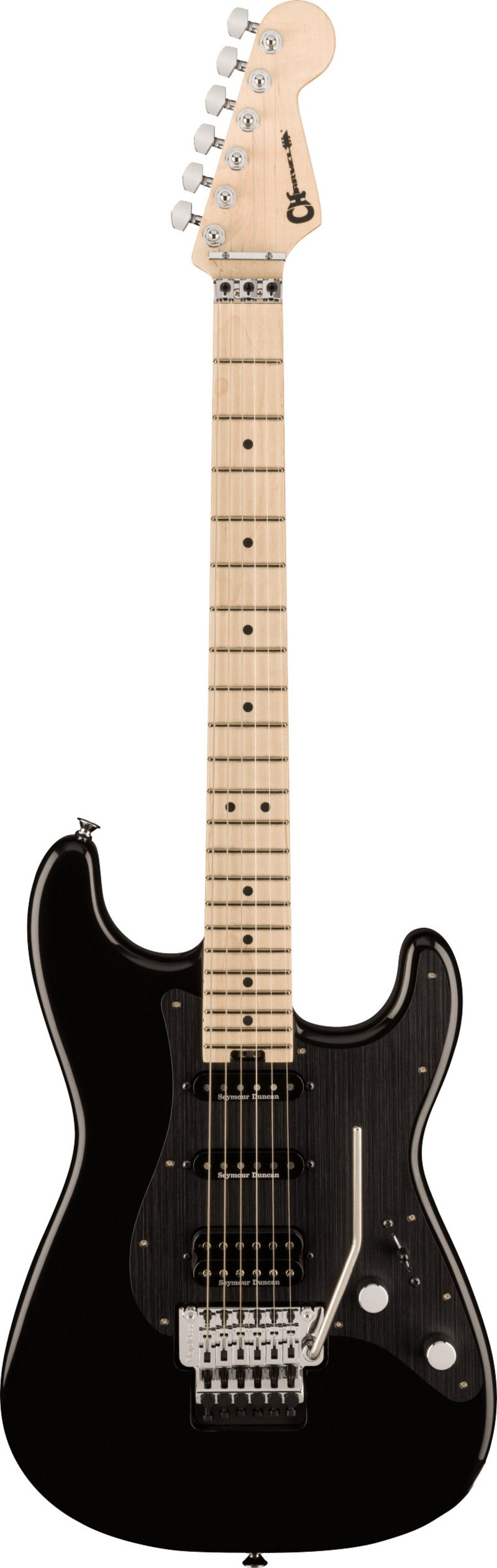 Floyd Rose 1000 Series double-locking tremolo ger stabil stämning även vid kraftig användning. Charvel-stämmskruvar och 1-ply anodiserad svart aluminiumplektrumskydd kompletterar den robusta stalllösningen.