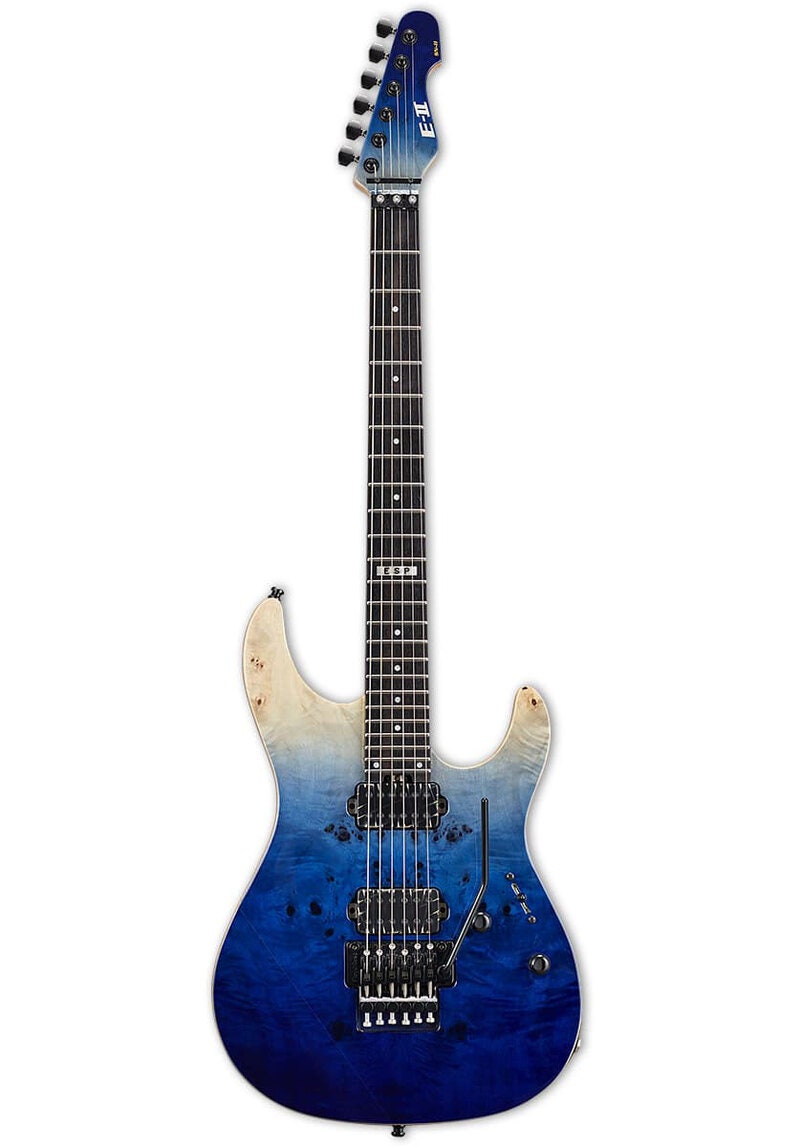 New to the ESP E-II Series, the E-II SN-2 is a Japan-built supercharged guitar for musicians who demand high performance in the studio or on stage. Based on the famous ESP Snapper shape, the E-II SN-2 offers a classic bolt-on construction with an alder body and maple neck with ebony fingerboard. The guitar comes in an outstanding Blue Natural Fade finish over a Buckeye burl maple top. Components on the E-II SN-2 include a Floyd Rose Original bridge, Schaller straplocks, and Gotoh locking tuners. Its sound comes form a pair of Bare Knuckle Aftermath Battleworn pickups, perfect for modern sounds with accelerated bass response, crushing midrange, and precise high-end articulation. Includes ESP hardshell case.