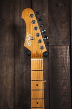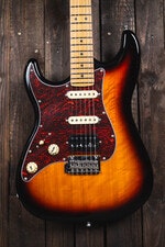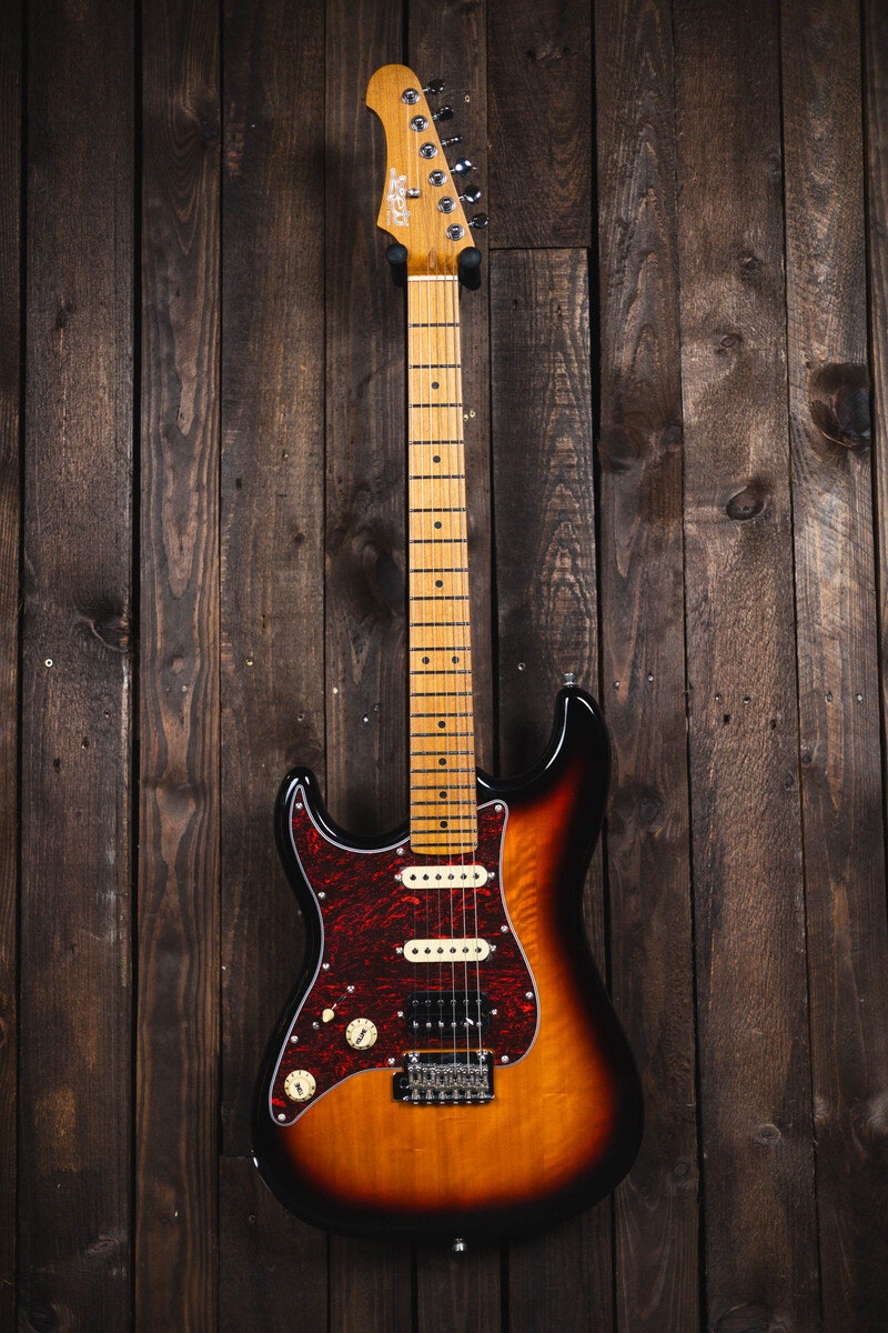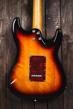 Artikelnummer 1095534B-Stock, Elgitarr vänsterhänt, basswood-kropp, roasted Canadian maple-hals, Modern C-profil, HSS keramiska mikrofoner, 2-punkts tremolo, Sunburst-finish, full garanti