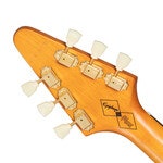 Made in partnership with the Gibson™ Custom Shop, the 1958 Korina Flying V™ is Epiphone’s impressive recreation of one of the most famous and valuable vintage guitars ever made. It brings authentic 1958 Flying V details to guitarists everywhere at a breakthrough price. Like the ultra-rare original Gibson models from 1958, it features a solid Korina body and a Korina neck with a long neck tenon and a 1958 Flying V neck profile. It is also equipped with an Indian laurel fretboard and gold hardware. The electronics are also top-notch, with Gibson Burstbucker™ 2 and Burstbucker 3 pickups wired to individual volume controls and a master tone control with CTS® pots and a Mallory™ capacitor, along with a Switchcraft® 3-way pickup selector switch and 1/4” output jack. An Epiphone x Gibson Custom logo on the back of the headstock is also proudly displayed, and a hardshell case is also included.