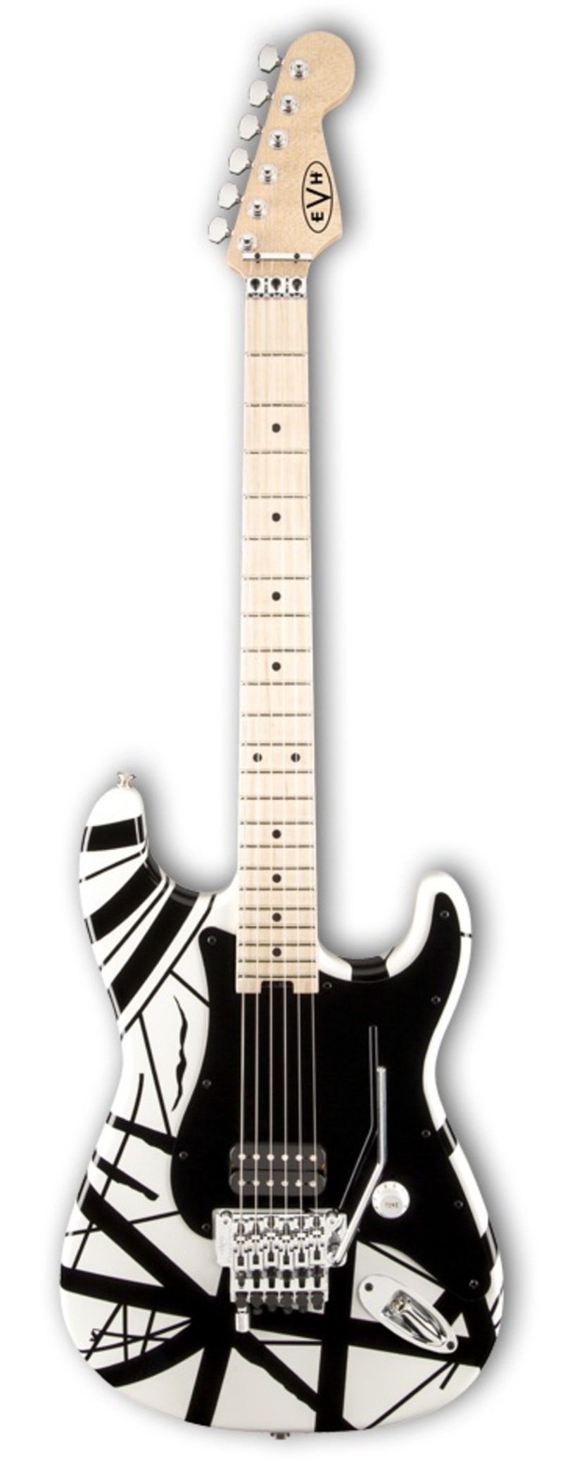 The guitar also has a graphite-reinforced quartersawn maple neck with a hand-rubbed oil finish and thumbwheel truss rod adjustment, compound-radius maple fingerboard (12”-16”) with 22 jumbo frets and black dot inlays, and a single ferocious direct-mount Wolfgang® humbucking pickup. Other premium features include a single white volume control knob (labeled “tone”), single-ply black pickguard (white with black stripes model only), bar string retainer and Floyd Rose® locking nut, EVH-branded Floyd Rose® locking tremolo with EVH D-Tuna®, EVH die-cast tuners, chrome hardware, vintage-style strap buttons and EVH neck plate.
