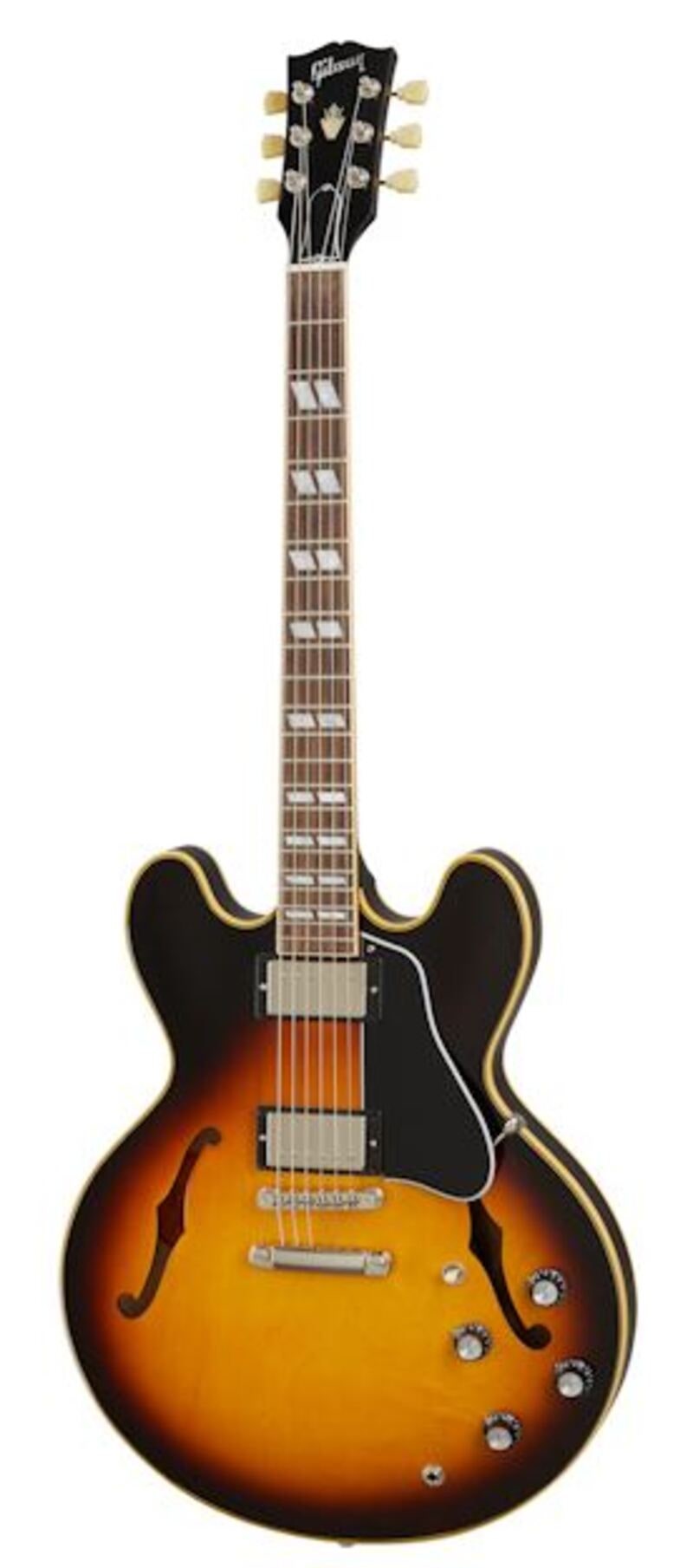 The ES-345 is equipped with a variety of high-end appointments like our hand-wired control assembly with Orange Drop® capacitors, Gibson's new Calibrated T-Type humbucking pickups, Vintage Deluxe style tuners and lightweight aluminum ABR-1 bridge and Stop Bar tailpiece anchored with steel thumb-wheels and studs. The ES-345 can be finished in either a vintage antiqued gloss Sixties Cherry or Vintage Burst.