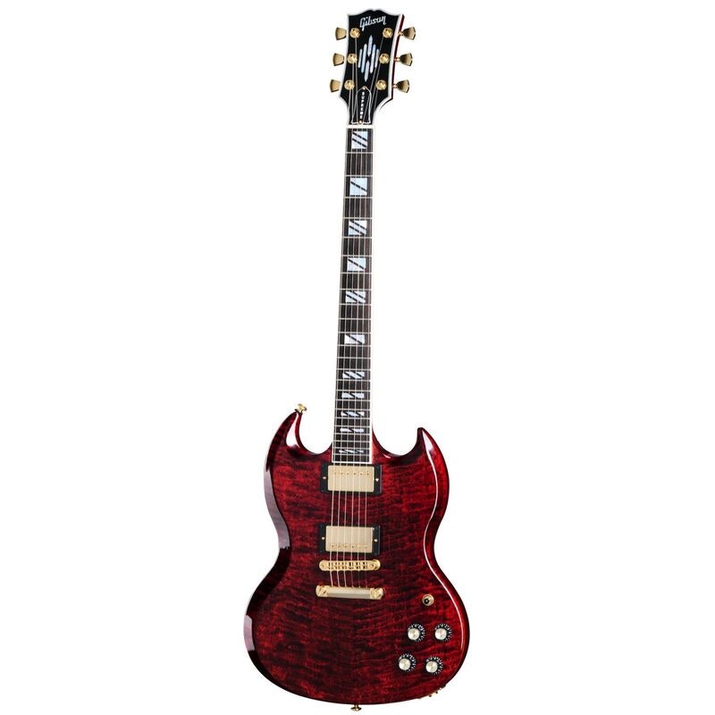 Gibson SG Supreme är en vidareutveckling av den klassiska SG-modellen, byggd med exklusiva material och modern konstruktion. Kroppen är tillverkad av mahogny och har en topp i AAA-lönn som framhäver träets naturliga ådring och ger ett unikt utseende. Kombinationen av mahogny och lönn bidrar till en tydlig ton med lång sustain och balanserad resonans.