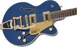 The G5655TG Electromatic® Center Block Jr. Single-Cut with Bigsby® and Gold Hardware features a smaller-sized body with a chambered spruce center block for dynamic resonance, high gain power and lightweight comfort.