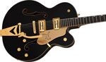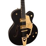 Bigsby® B60 V-Cutout vibrato kombineras med ett Adjusto-Matic™-stall monterat på en säkrad ebenholtsbas för stabilitet och klassisk Gretsch-respons. Guldfärgad hårdvara, guldsprakande binding och matchande detaljer på kropp, hals och huvud fulländar instrumentets exklusiva uttryck.