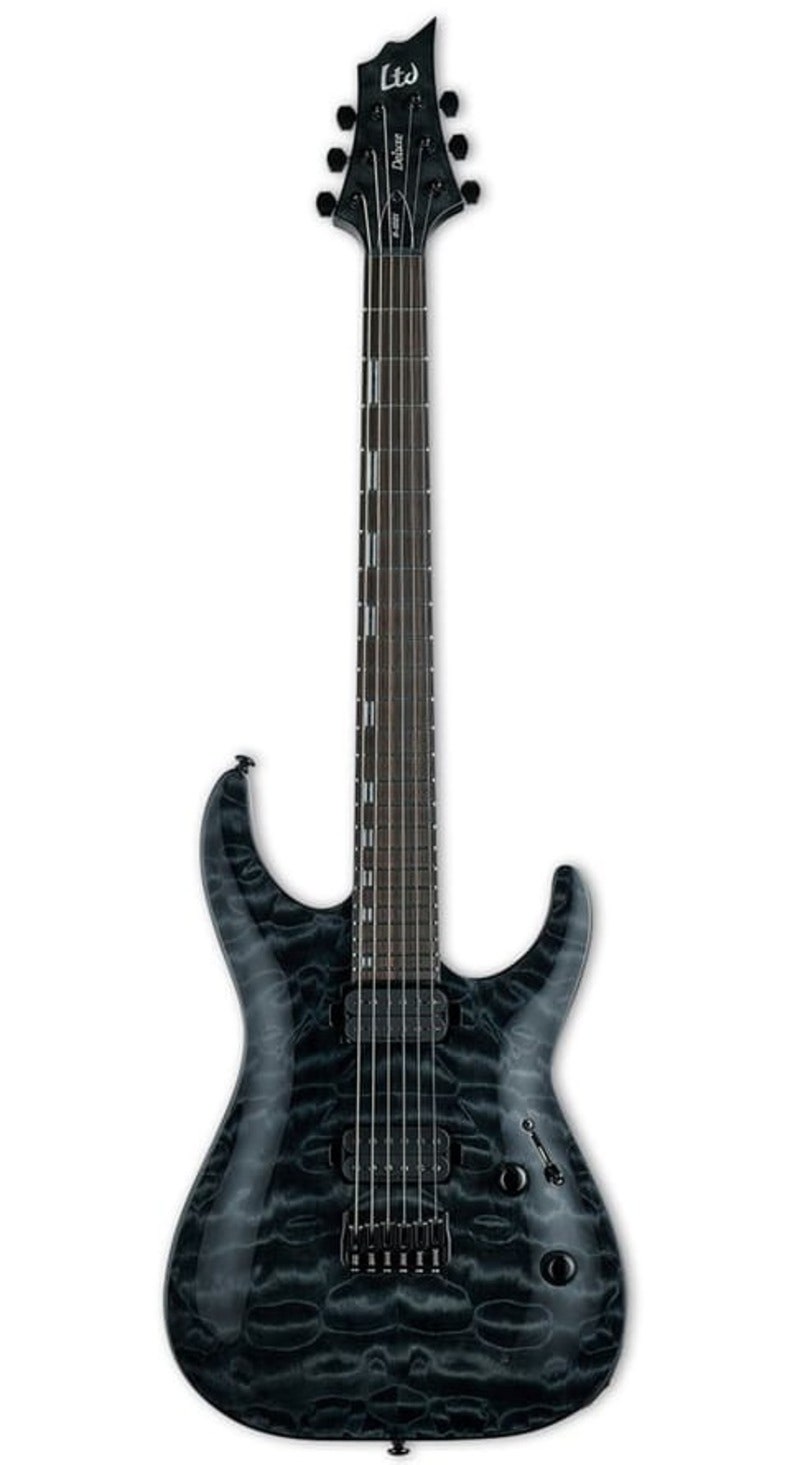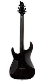 Guitars in the LTD 1000 Series are designed to offer the tone, feel, looks and quality that working professional musicians require in an instrument. The H-1001 looks spectacular with its mahogany body and a spectacular quilted maple top in See Thru Black finish, with a set-thru three-piece maple neck. It has a pair of high-output, direct-mount Seymour Duncan Sentient (neck) and Pegasus (bridge) passive pickups, splittable by a push-pull control. These pickups offer a wide dynamic range and excellent articulation, along with the aggressive responsiveness you want for today’s music. The H-1001 offers other high-quality components like a Hipshot hardtail bridge with string thru body, and LTD locking tuners.