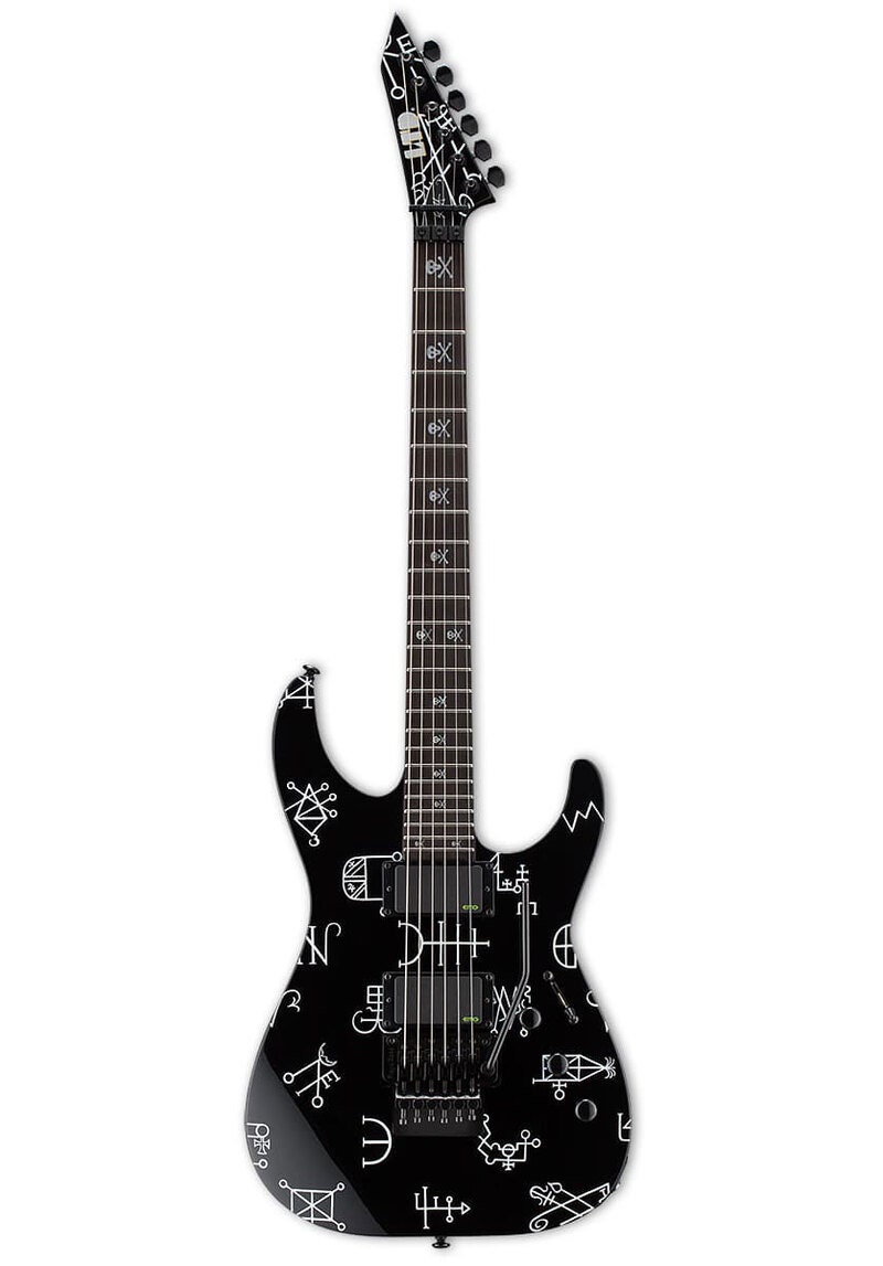 Metallica's Kirk Hammett is fascinated by the strange and macabre aspects of life, evidenced by his custom guitars featuring classic horror art and paranormal phenomena, most famously seen in his well-known Ouija guitars. The next step in his LTD Signature Series is the KH Demonology, a guitar powerful enough to summon the mightiest of dark forces. Over its black finish are a number of sigils, which are ancient symbols reputed to be imbued with magical power that allows the owner to summon demonic entities. Whether or not you use the KH Demonology as a portal to magical dimensions, it's an amazing musical instrument in its own right. The KH Demonology is a neck-thru-body design at 25.5" scale, with a comfortably contoured alder body, an extra-thin U-shaped three-piece maple neck, and a pau ferro fingerboard inlaid with Kirk's skull-and-crossbones motif, along with 24 extra-jumbo frets. A set of EMG Kirk Hammett Bone Breaker Signature pickups provide a range of tones that go from deep and rich to super aggressive with the flick of a toggle switch, and each pickup has its own volume control. The KH Demonology includes a Floyd Rose tremolo for expressive performance styles, and comes with a special Tombstone case, appropriate for this unearthly tool of musical mayhem.