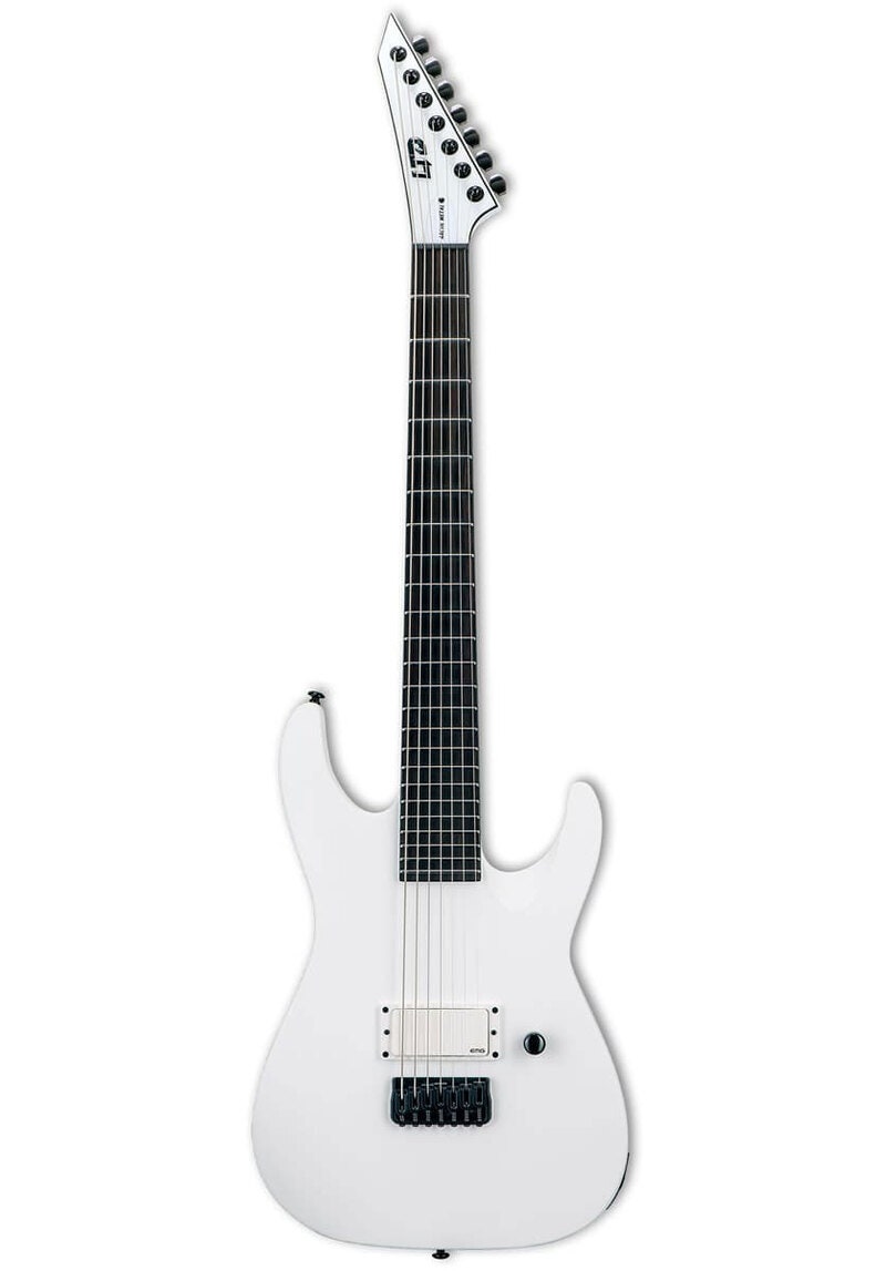 The LTD Arctic Metal Series takes the same design theme of our Black Metal Series and flips the color scheme from the darkest of blacks to the coldest of frozen wastelands. Comparable in build quality to our LTD Deluxe “1000 Series”, Arctic Metal instruments feature a Snow White Satin finish, a single premium-quality pickup with matching white cover, and Macassar ebony fingerboards with no inlays and glow-in-the-dark side markers. The 7-string, 27” scale baritone M-7BHT Arctic Metal features neck-thru-body construction, an aggressive EMG 81-7H pickup with black logo, a single volume knob with push-pull control to split the pickup, a Hipshot bridge with string-thru-body design, and 24 extra-jumbo stainless steel frets.