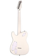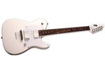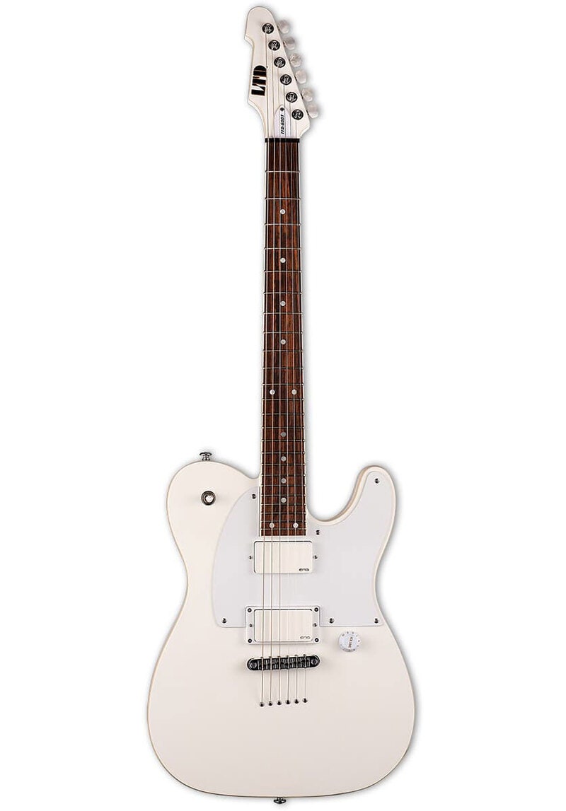 The LTD TED-600T is a new TE-shaped guitar customized by Ted Aguilar of Bay Area thrash titans Death Angel. You'll first notice its "white on white" design aesthetic, with a Snow White finish, white binding, white controls, and white covers on its EMG 60 (neck) and EMG 81 (bridge) pickups. The TED-600T offers neck-thru-body construction with a mahogany body (with maple cap), 3-piece mahogany neck, and a TonePros locking TOM bridge with string-thru-body design.