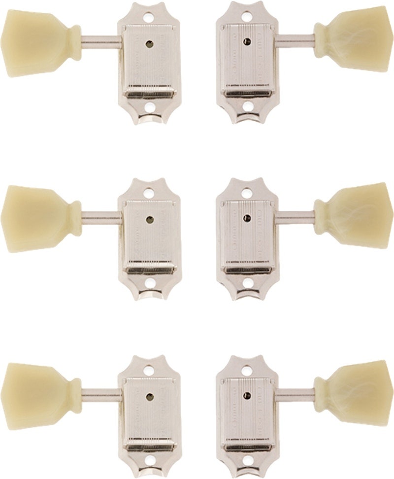They are made from nickel with push-in bushing machine heads and closed construction housing, adding a classic feel and look to any guitar headstock with exceptional tuning stability and durability. This OEM part is available in Nickel finish.