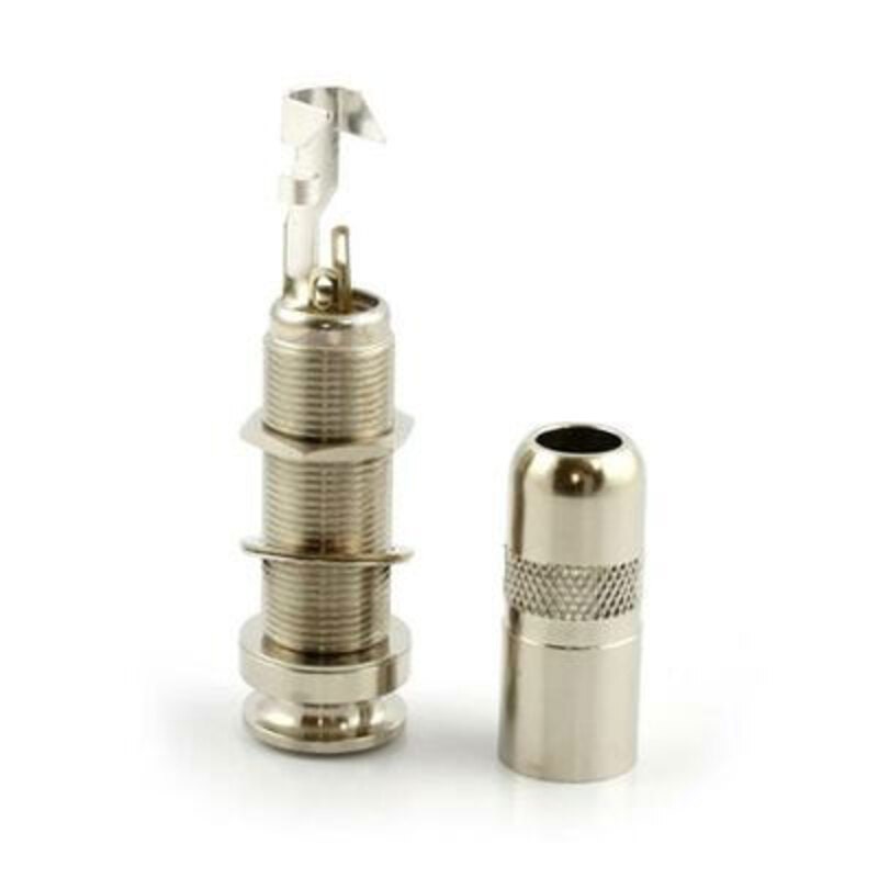 Switchcraft stereo end pin jack with housing. Easily tighten the housing from inside the guitar for a simple installation. This end pin jack can be wired for a mono or stereo setting.