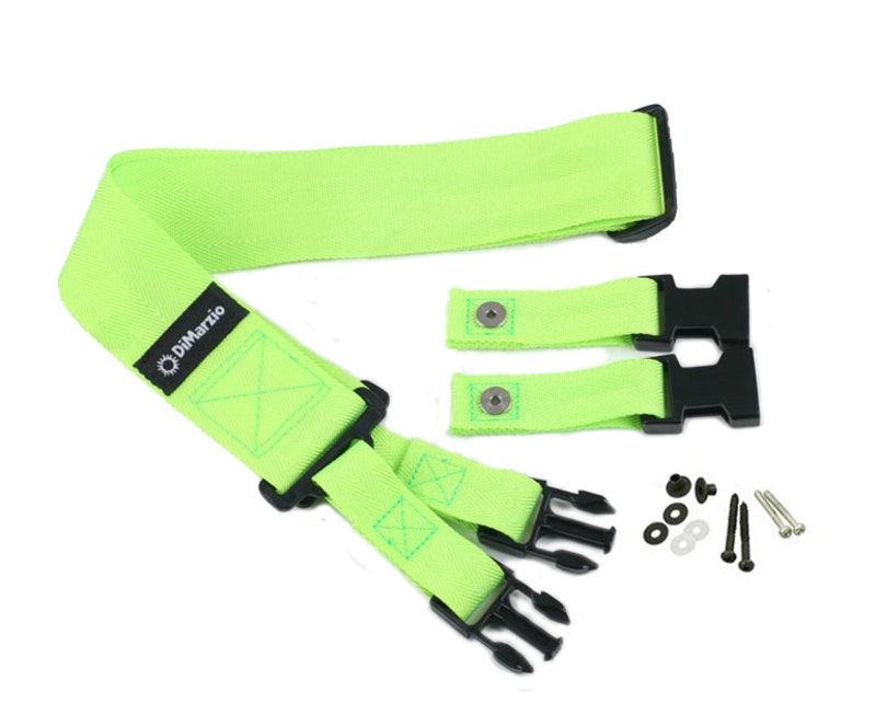 DD2200GN ClipLock® Green Neon. DiMarzio® ClipLock® gitarraxelband använder slitstarka plastklipp som gör att du kan byta axelbandet från en gitarr till en annan med ett litet tryck med fingertopparna. Industristandard för styrka, säkerhet och kvalité. Monteras på gitarren med medföljande två kraftiga metallbussningar och extra långa skruvar som passar i axelbandsknopparnas skruvhål på dom flesta gitarrer. • Slitstarka materialet Nylon formar sig efter din kropp och ger en hög komfort. • Bredd 50,8mm (2 ). • Kan justeras i längder från 109 till 160 cm. • Färg: GN (grön neon).