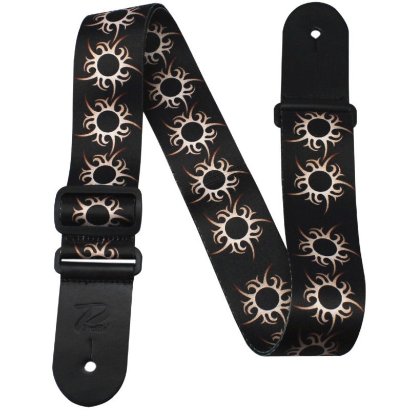 Artikelnummer 1058300Axelband i polyester till bas & gitarr, ändar i italienskt läder, slitstarkt, svart med Tribal Sun-motiv.