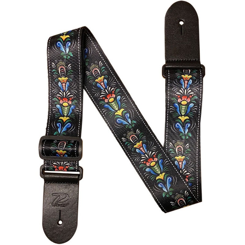 Artikelnummer 1066726Axelband i polyester till bas & gitarr, ändar i italienskt läder, slitstarkt, svart med Kurbits-motiv.