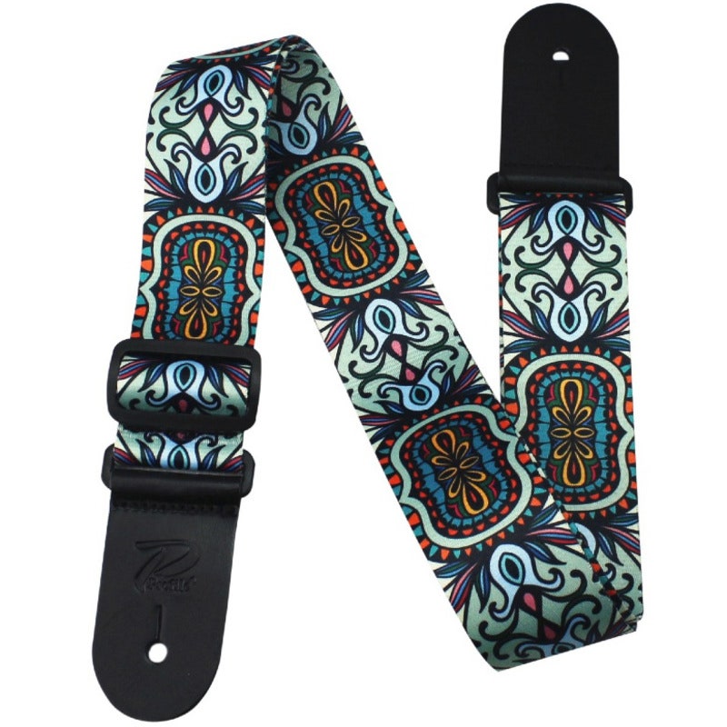 Artikelnummer 1058295Axelband i polyester till bas & gitarr, ändar i italienskt läder, slitstarkt, Modern Paisley-motiv.