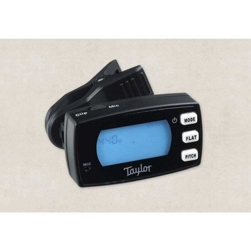 Artikelnummer 1066710Taylor Guitars Digital Headstock Tuner. Clip-on chromatic guitar tuner picks up vibration and comes with a built-in mic. Back-lit LCD changes color to show correct tuning. Swivel design for easy viewing. Automatic power-off after 5 minutes. Quadra flat tuning for tuning with capo on. “A” calibration: 433-447 Hz with 1 Hz steps. Accuracy: ± 0.5 Cent. One coin cell battery included.