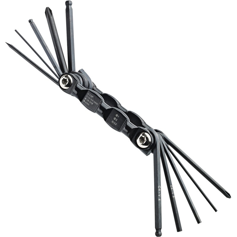 Multiverktyget innehåller tio olika verktyg: Insex-nycklar 0,05", 1,5mm, 2,5mm, 3mm. Insex-nycklar med rundat huvud 1/8", 3/16", 4mm. Stjärnmejslar Phillips 1 och 2. Spårmejsel 2,5mm