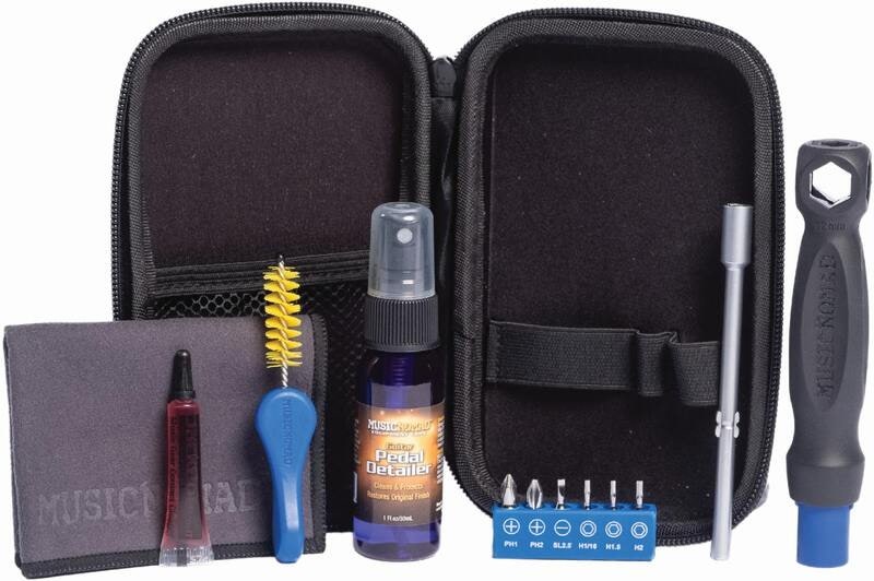 Artikelnummer 1087856Skötselkit för pedaler med verktyg för att dra åt muttrar, skruvbits, polerduk, borste, elektronik och rengöringsmedel.