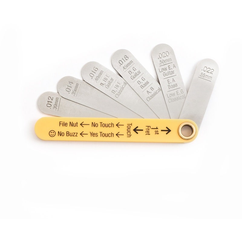 Being able to measure your string height at the nut is a critical step in the setup process. MusicNomad’s precision Nut Height Gauge will help you do it quickly & accurately. The gauge comes equipped with the 3 most common nut height sizes (.016”, .018”, .020”) plus 3 additional sizes (.012”, .014”, .022”) to accommodate a desire for lower action or a heavier pick attack. Instructions printed right on the handle makes it extremely easy to dial in your nut height. It’s perfect for electric, acoustic, classical & bass guitars & features laser etched markings that take the guesswork out of which gauge to use for each instrument. It’s made of premium stainless steel construction without the annoying, messy oil found on traditional feeler gauge sets. That's MusicNomad quality – raising the bar in equipment care.